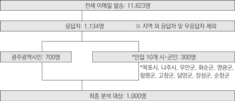이 연구를 위한 자료수집은 온라인 설문조사를 활용하였다. 조사는 설문조사 전문업체(마크로밀엠브레인)의 온라인 패널을 통해 2024년 9월 20일부터 27일까지 실시되었다. 본 조사의 표본은 공항 이전으로 영향을 받을 가능성이 있는 광주광역시 시민 700명과 인접 시・군(목포시, 나주시, 무안군, 화순군, 영광군, 함평군, 고창군, 담양군, 장성군, 순창군) 지역민 300명을 대상으로, 할당표본 추출법(quota sampling)을 사용하여 구성되었다. 총 11,823건의 설문조사 이메일을 발송한 결과, 1,134명이 조사에 참여하였다. 그중 대상 지역이 아니거나 중도 포기 등의 불성실한 응답자를 제외하고, 총 1,000명의 설문 데이터를 분석에 사용하였다<표 2>.